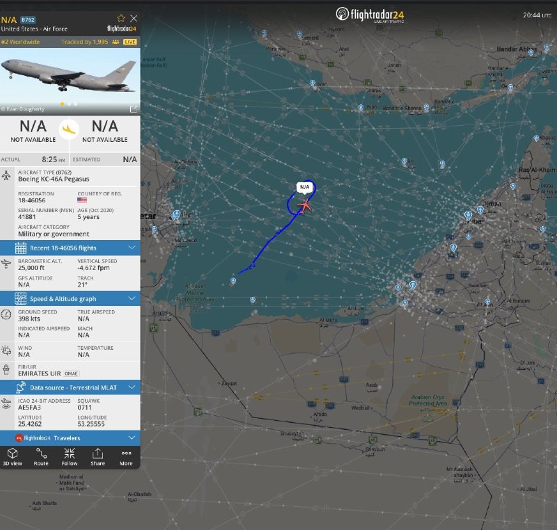 🇺🇸🇦🇪🗺 — 1x USAF Boeing KC-46 Pegasus airbone over Persian Gulf (AE5FA3 | 18-46056) from United Arab Emirates @BellumActaNews View Source