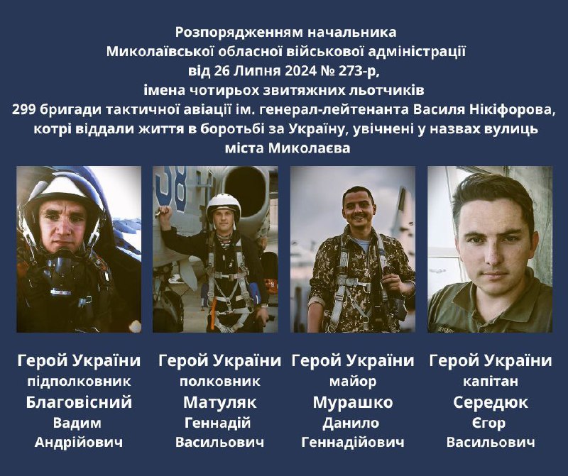 From now on, four streets in Mykolaiv will bear the names of pilots — Vadym Blagovisny, Gennady Matuliak, Danylo Murashko, Yehor Seredyuk. All of them are Heroes of Ukraine, awarded this highest title posthumously. All served in the Air Force’s 299th Tactical Aviation Brigade.