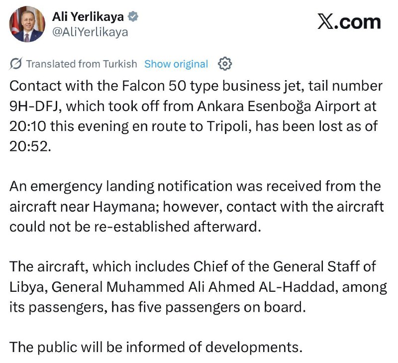🇹🇷🇱🇾 – A private jet believed to be carrying Libyan Army Chief of Staff Mohammed Ali al-Haddad lost radio contact over Ankara. He had met senior Turkish military officials in Ankara earlier today. @thewarreporterr