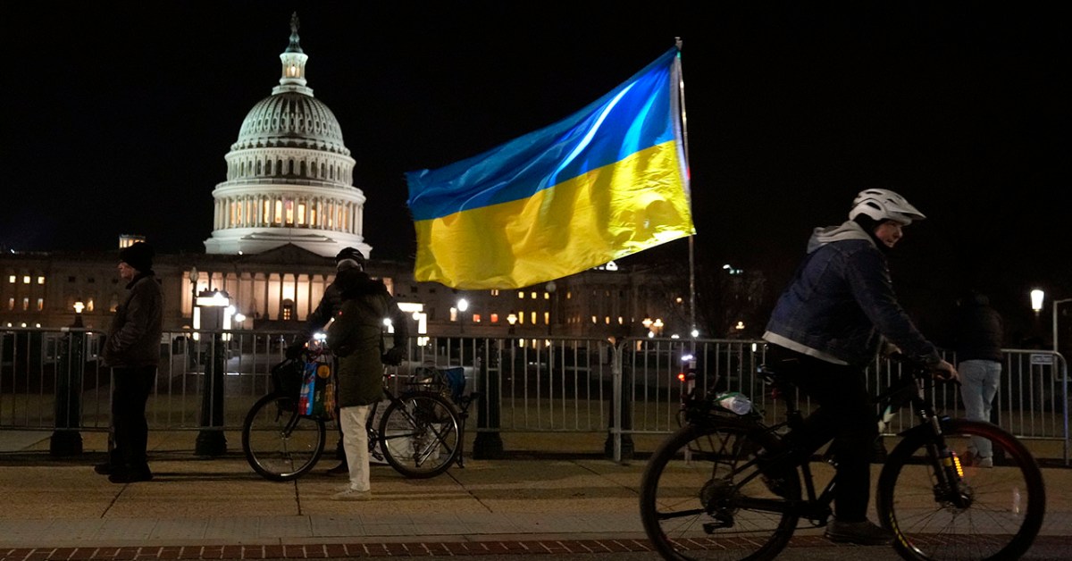 The Ukrainian flag flies near the U.S. Capitol on Dec. 21, 2022, the night Ukrainian President Volodymyr Zelenskyy addressed a joint meeting of Congress. (Drew Angerer/Getty Images)