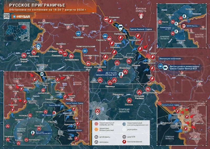 According to Russian source Rybar, Ukrainian forces managed to penetrate deep towards Korenevo, as well as entering Sudzha from the south. This would mean Oleshnya, Melovoi, Rubanshchina and Honcharevka are taken by the AFU. Guevo, Gornal and Kurylivka were also confirmed under UA control.