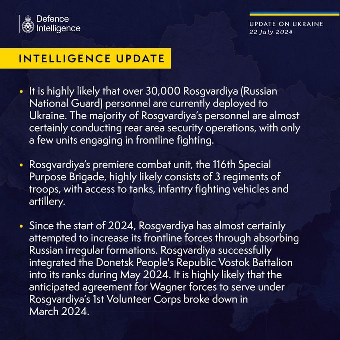 According to UK Defence Intelligence, more than 30.000 personnel from the Russian Guard, a military unit directly subordinate to Putin, are currently stationed in Ukraine. They believe that the majority of Russian Guard members are responsible for protecting locations in the rear, with only a few units participating in combat on the front lines.