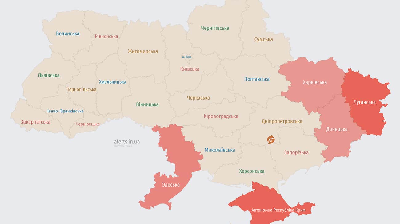 Map of air-raid warnings in Ukraine, with red marking areas where air-raid warnings were issued. Screenshot: alerts.in.ua