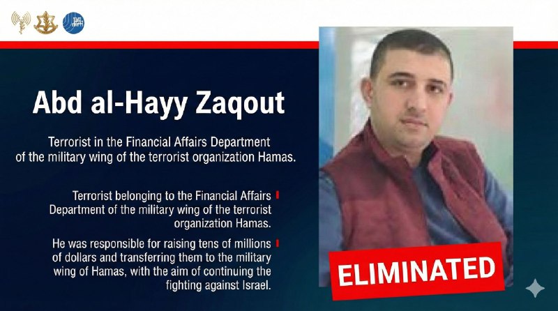 The operative, Abd al-Hayy Zaqout, was traveling with Saad when the vehicle was struck on December 13, IDF officials said. Zaqout served in Hamas’s finance division and played a central role in funding its military activities.