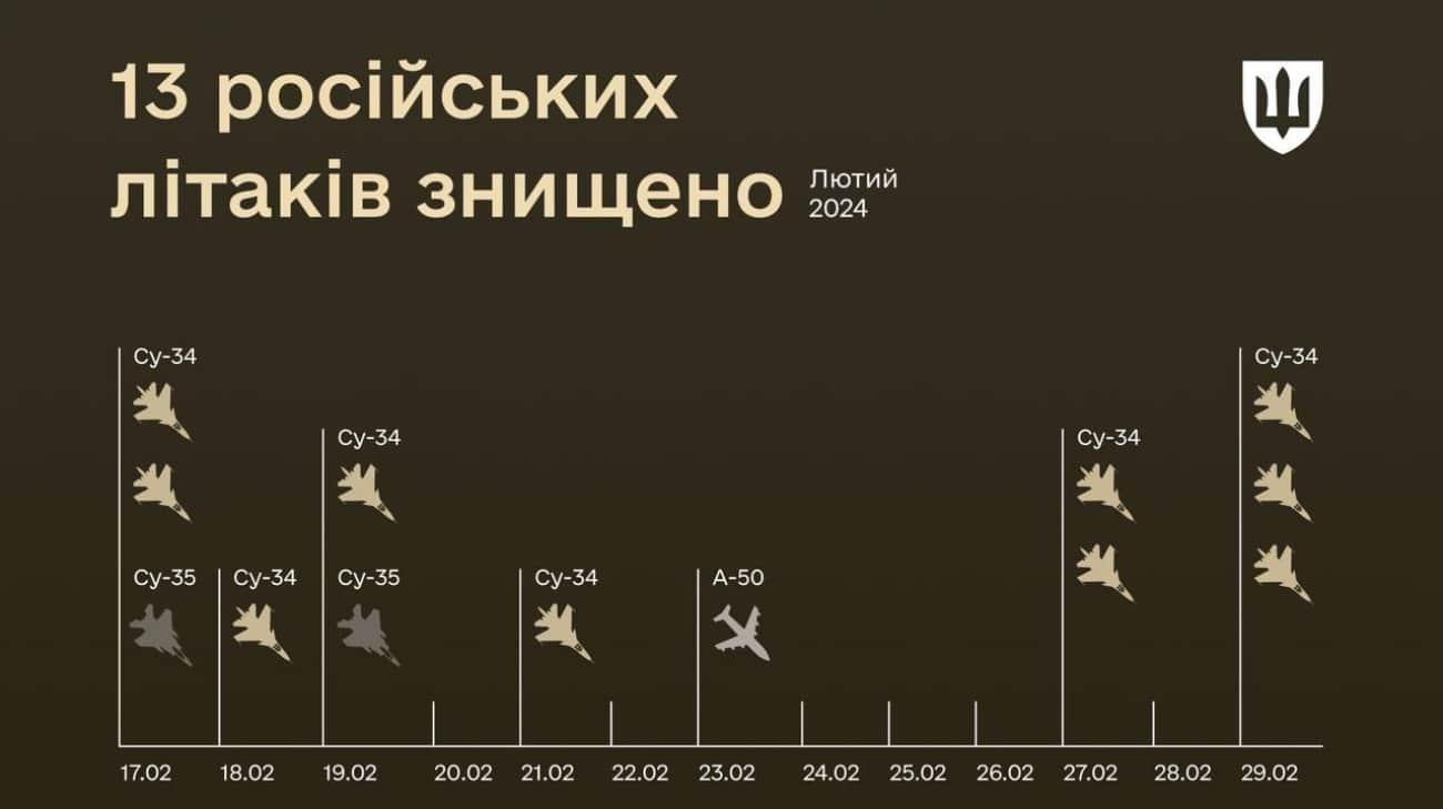 Ukraine’s Defence Ministry has reported that the Ukrainian Air Force shot down 13 Russian aircraft in February 2024.