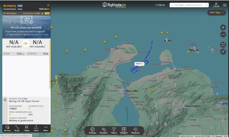 🇺🇸🇻🇪❗️ — 2x US Navy Boeing F/A-18F Super Hornet are operating INSIDE VENEZUELAN AIR SPACE at the entry of Maracaibo Bay!