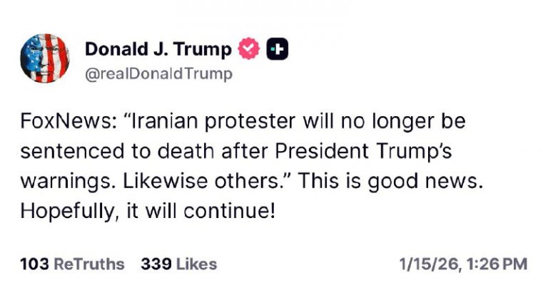 BREAKING – Trump posts on Truth Social: “FoxNews: ‘Iranian protester will no longer be sentenced to death after President Trump’s warnings. Likewise others.’ This is good news. Hopefully, it will continue!” Our opinion: Psychological warfare. 🇺🇸 WHATSAPP GROUP 🔗 …
