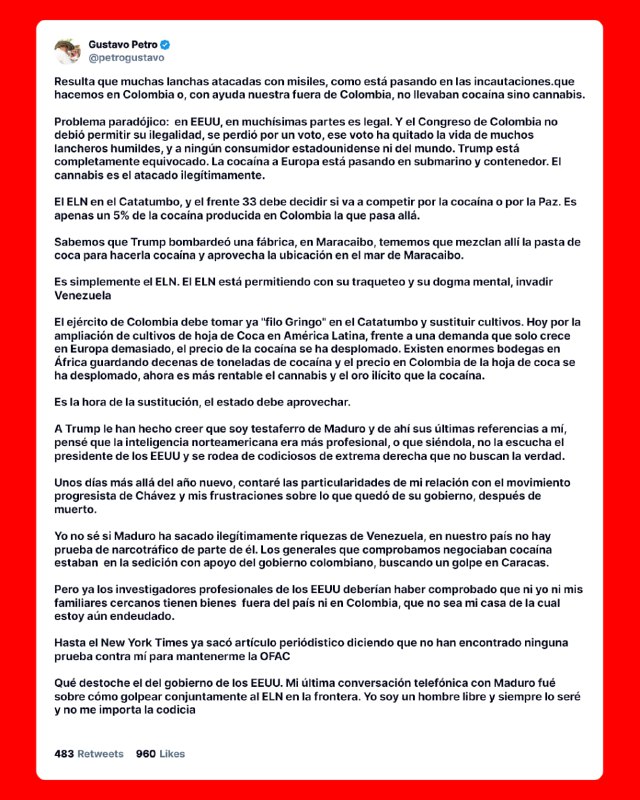 🇨🇴✔️🇺🇸 — 🇻🇪 The president of Colombia, Gustavo Petro, officially acknowledges that the United States bombed an ELN factory in Maracaibo, Venezuela, and contradicts Nicolás Maduro, who denies that this happened: “It turns out that many boats attacked with missiles,…