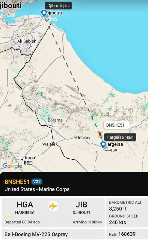 🇺🇸🇩🇯🇸🇴⁉️ — TRACKED: A U.S. Marine Corps MV-22B Osprey tilt-rotor aircraft (registration 168639) once again conducted a flight from Djibouti to Hargeisa in Somaliland. ➡️This has sparked questions over which officials or personnel may currently be visiting the region. View…