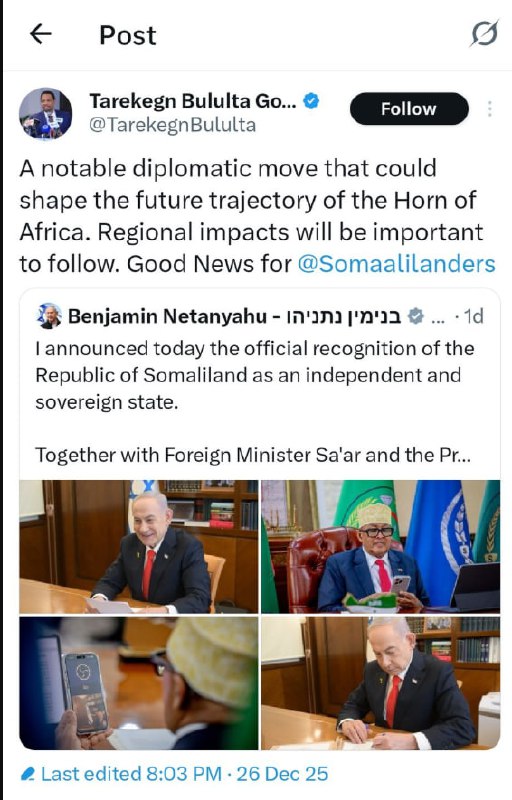 🇪🇷🇨🇳❌🇸🇴🇮🇱 — The Minister of Information of the Eritrean Regime, Yemane G. Meskel, condemns Israel for recognizing Somaliland as an independent Nation and calls on Communist China to act against Israel under an analogy with Taiwan The ploy does not…