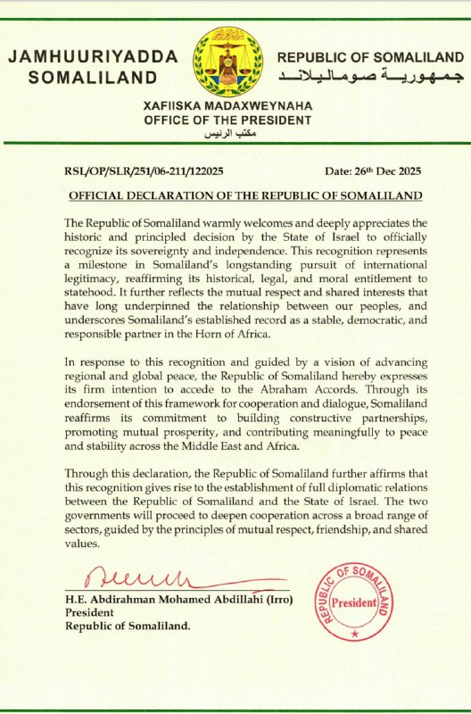 Israel officially recognizes the Republic of Somaliland as an independent state. Israel will now work hand-in-hand with Somaliland to build a future of security, innovation, and hope. Israeli Prime Minister’s Office: “Prime Minister Benjamin Netanyahu announced today the official recognition…