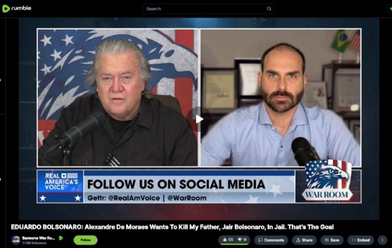 🇧🇷🇺🇸💥⚖️👨⚖ — 💬 Federal congressman Eduardo Bolsonaro (PL), who is exiled in the United States, spoke with former White House strategist Steve Bannon on the program War Room, from the outlet Real America’s Voice. In the interview, he asked the…