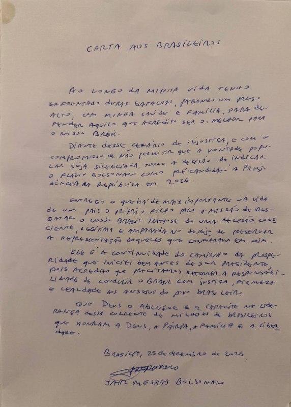 🇧🇷😎📝 — In a handwritten letter from prison addressed to all Brazilians, former Brazilian president Jair Bolsonaro confirms the nomination of his son, Flávio Bolsonaro, as his candidate for the presidency, and states that this decision is costing him his…
