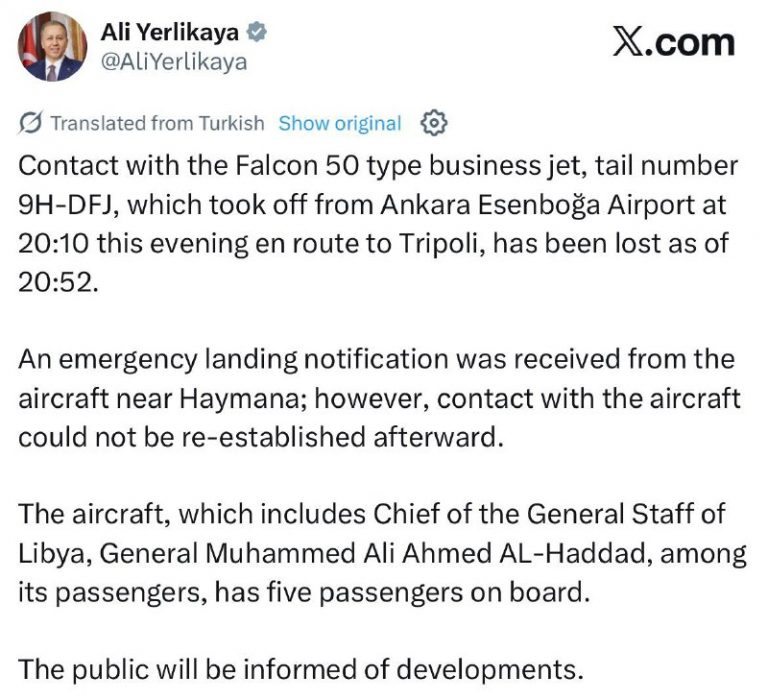 🇹🇷🇱🇾 – A private jet believed to be carrying Libyan Army Chief of Staff Mohammed Ali al-Haddad lost radio contact over Ankara. He had met senior Turkish military officials in Ankara earlier today. @thewarreporterr View Source