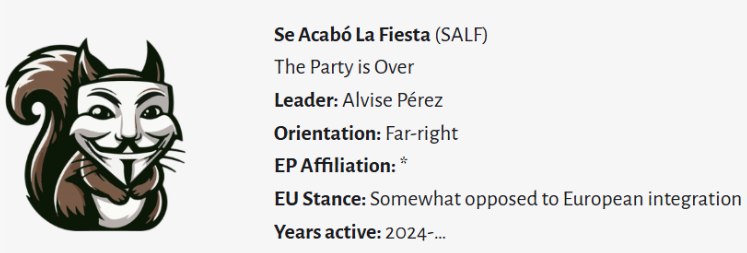 🇪🇸🏴☠️👺🗳📃 — Spanish Far-Right/Libertarian/Alt-Right/Pirate Party Se Acabó La Fiesta (The Party is Over/SALF) enters the European Parliament for the first time with 3.9% of the votes and between 2 and 3 seats. The party is led by Alvise Pérez, was…