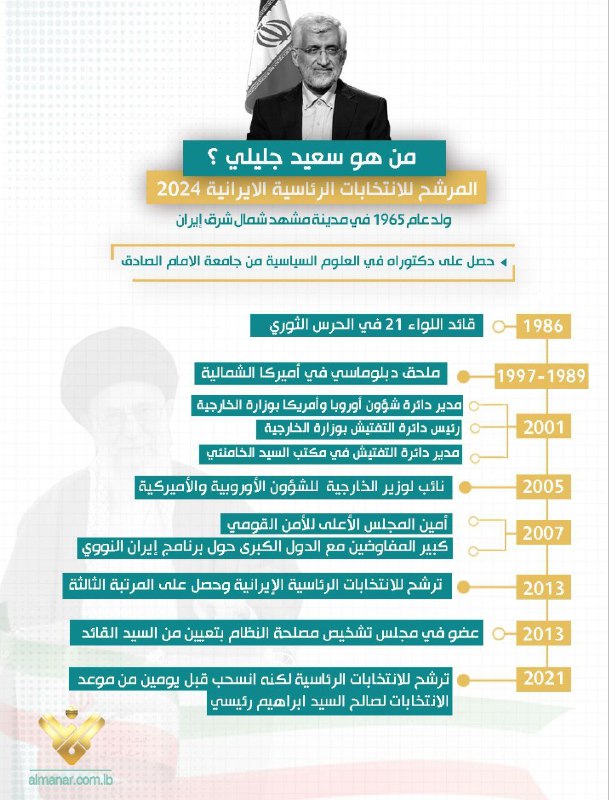 🇮🇷🔴Al-Manar (🌟) Channel’s infographic about Saeed Jalili. Who is Saeed Jalili?A candidate for the 2024 Iranian presidential elections He was born in 1965 in the city of Mashhad, northeastern #Iran He obtained a doctorate in political science from Imam Sadiq…