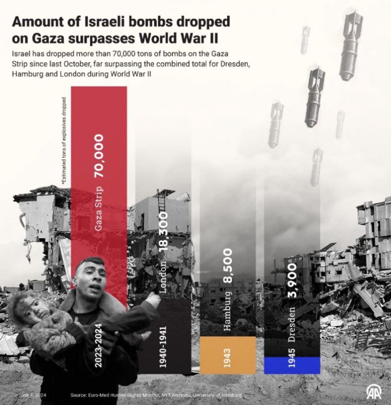 The number of Israeli bombs on Gaza has surpassed the Second World War Since October 7th, Israel has dropped more than 70000 tons of bombs on people in the Gaza Strip, which is much more than the combined bombs dropped…