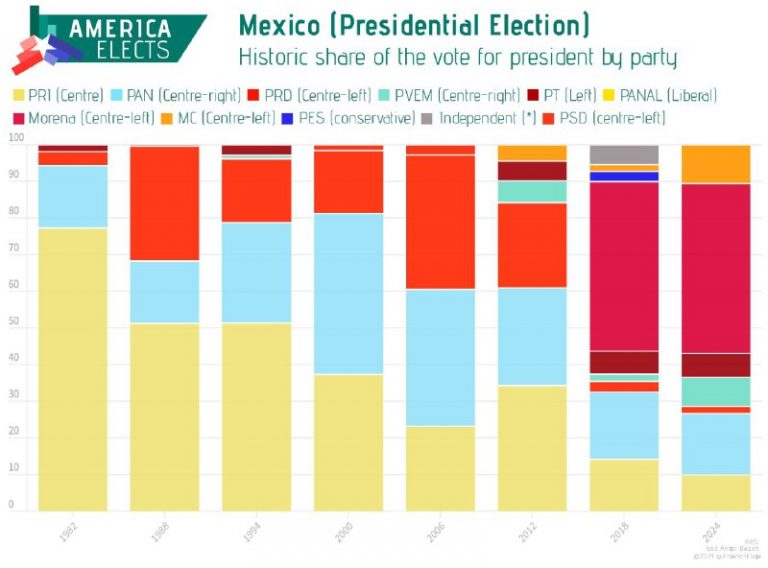 🗳 🇲🇽 Mexico: 🔶️ With 96% of the presidential vote counted, here is a historic share of the presidential vote by party since the 1982 election. 🔶️ This year’s election would mark the worst results for the three parties of…