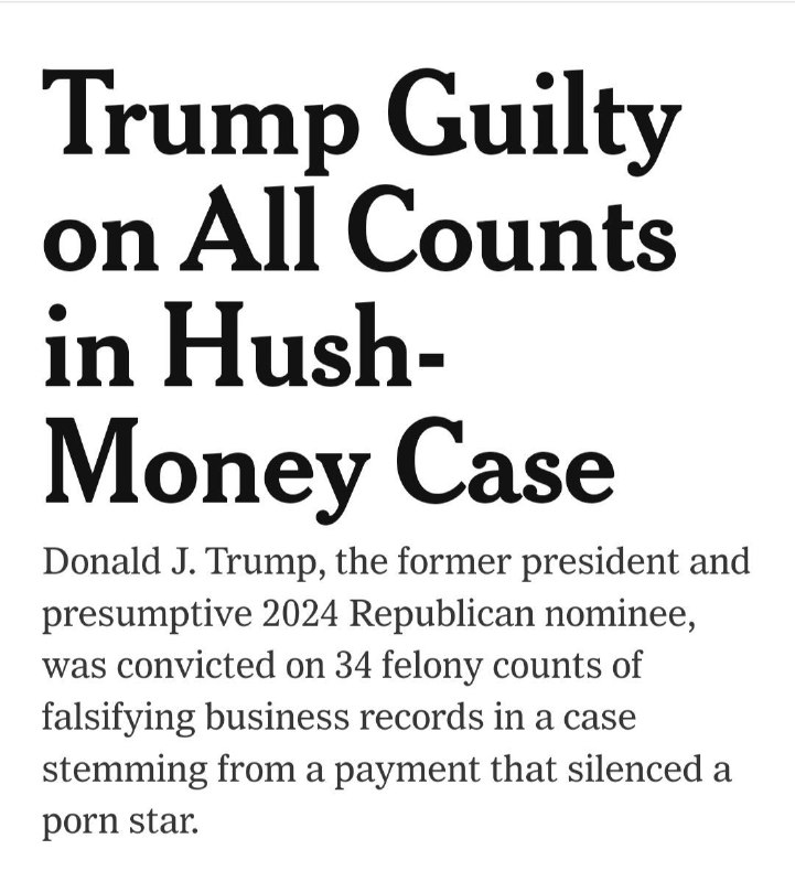 🇺🇸 New York court found Trump guilty in the case of paying hush money to an actor in pornographic films. In response to the court verdict, Trump said: I am innocent. It was a sham trial. The real judgment will…