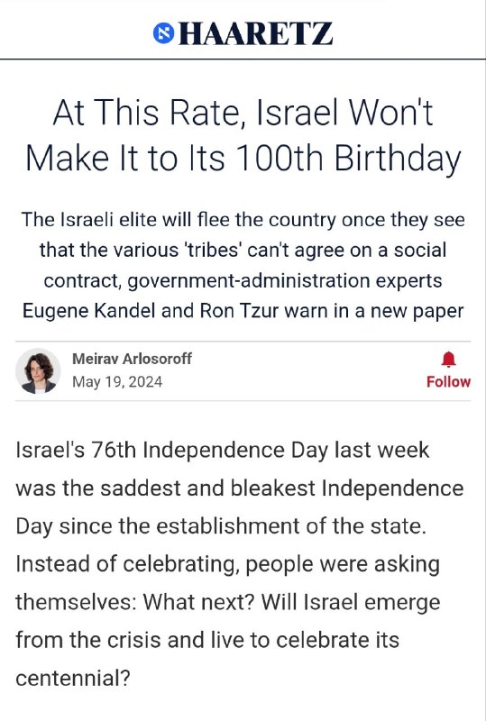 Haaretz Zionist newspaper: At this rate, Israel won’t make it to its 100th birthday.🦅@SNNenglish View Source