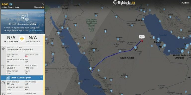🇺🇸 — US Navy C-2A cargo aircraft (Reg: 162161) which likely took off from the aircraft carrier USS Eisenhower possibly heading to Bahrain. View Source
