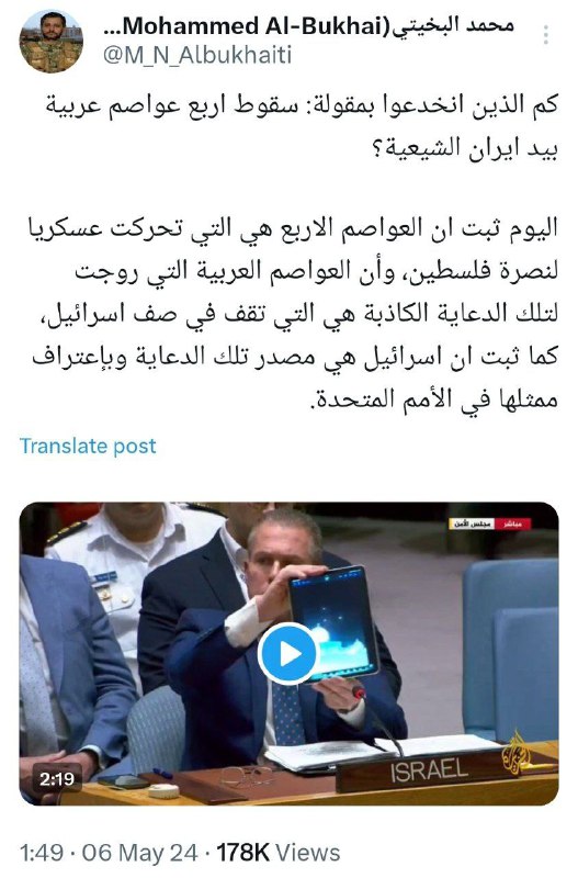 🇾🇪/🇮🇷/🇮🇱 Mohammed Al-Bukhaiti, member of Ansar Allah’s political office and governor of Dhamar, published a video of the Zionist regime’s representative lying about Iran in the United Nations and wrote: — How many people were deceived by this sentence? “Four…