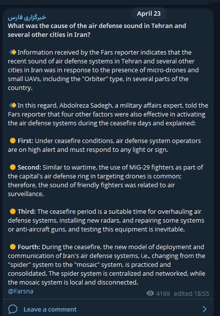 🇮🇷❌🇮🇱🇮🇷 — IRGC-controlled Fars News says that air defense systems in Tehran and several other cities in Iran were activated in response to the presence of micro-drones and small UAVs, including the “Orbiter” type which are flying in several parts…