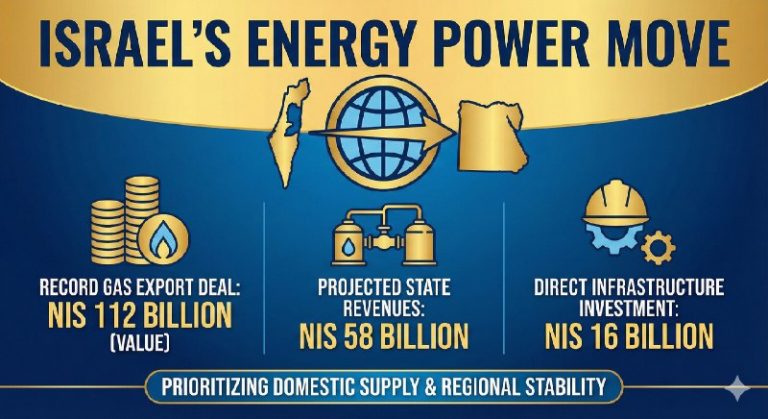 Israel Approves Record NIS 112 Billion Gas Export Deal to Egypt, Cementing Its Role as a Regional Energy Powerhouse Israel approved a record gas export agreement to Egypt worth NIS 112 billion, with officials projecting roughly NIS 58 billion in…