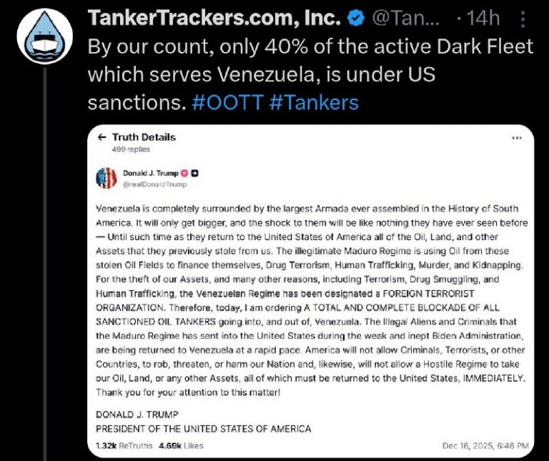 🚢🛢️ “By our count, only 40% of the active Dark Fleet which serves Venezuela, is under US sanctions” -TankerTrackers View Source