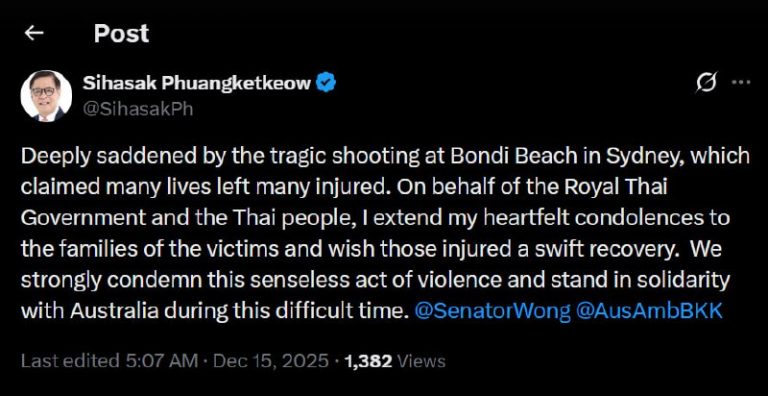 🇹🇭🤝🇦🇺🕎 — Minister of Foreign Affairs of Thailand, Sihasak Phuangketkeow, condemns the Terror Attack in Australia: Deeply saddened by the tragic shooting at Bondi Beach in Sydney, which claimed many lives left many injured. On behalf of the Royal Thai…