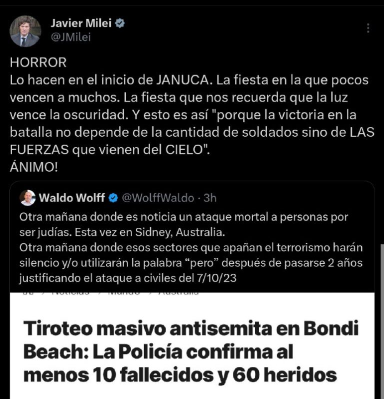 🇦🇷🇦🇺🇮🇱❌🏴 — Argentine President Javier Milei condemned the terrorist attack that took place in Australia and expressed his solidarity with the Jewish community. Following the attack in Bondi Beach, which left at least 10 people dead and more than 60…