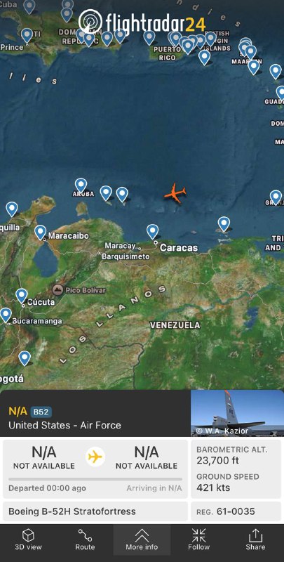 Stratofortress near the Venezuelan Islands (Dependencias Federales). Heading to the Dutch ABC Islands View Source