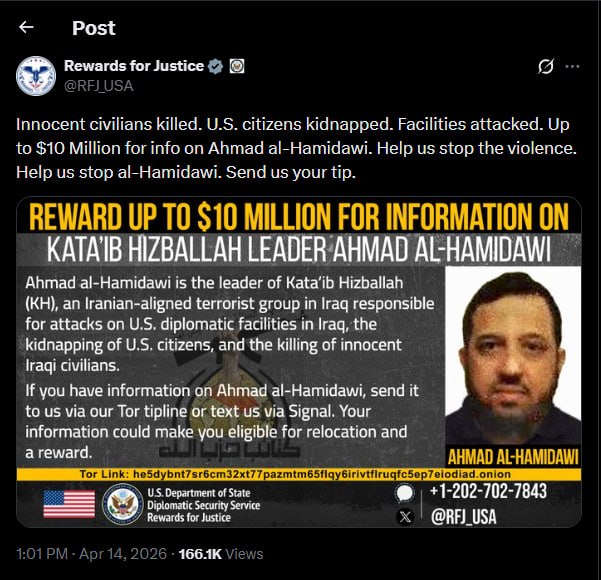 🇺🇸❌🇮🇶 — United States Department of State’ Rewards for Justice is now offering a reward of up to $10 Million for info on Ahmad al-Hamidawi, the leader of Kataib Hezbollah terror organization, sanctioned as a Specially Designated Global Terrorist (SDGT)…
