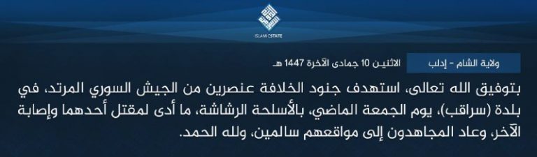 🏴❌🇸🇾 — In one of the Islamic State’s first operations in Idlib Governorate in years, two Syrian Transitional Goverment soldiers were targetted in Saraqib, one killed, the other injured. The perpetrators are at large. View Source