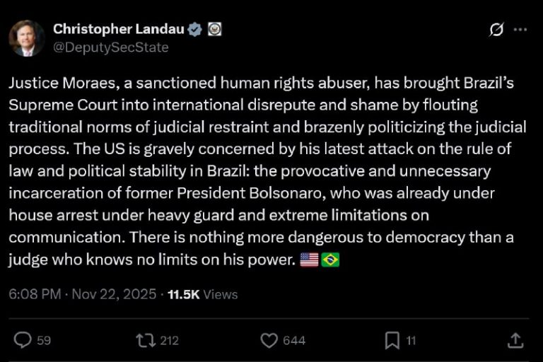 🇺🇸🇺🇸💥🇧🇷⚖️👨⚖ — 😎 U.S. Deputy Secretary of State and Ambassador Christopher Landau issued a strongly worded statement condemning Brazilian Supreme Court Justice (STF) Alexandre de Moraes for ordering the full incarceration of former President Jair Bolsonaro Justice Moraes, a sanctioned…