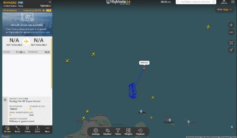 🇺🇸❌🇻🇪🇨🇴 — US Navy Boeing F/A-18F Super Hornet (# – RHINO62) flying in circles near La Guajira Peninsula and Maracaibo bay’s entry, both places being strategic for Colombia’s ELN and Maduro’s Bolivarian National Guard-controlled drug smuggling networks View Source
