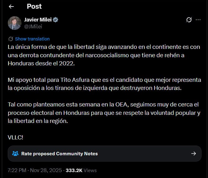 🇦🇷🐍🤝🇭🇳🇵🇸 — Speaking about the Honduran elections, Argentine President Javie Milei declares his support for the moderate conservative candidate Nasry Asfura, an Honduran Palestinian running for Presidency against the Maduro-backed Rixi Moncada from the leftist Libre Party and the centrist…