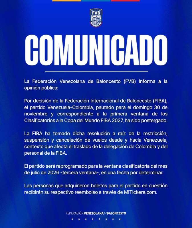 🇨🇴🇻🇪🏀🚫 — The International Basketball Federation (FIBA) suspends the match between Venezuela and Colombia. The decision was made due to flight restrictions and cancellations in Venezuela. View Source
