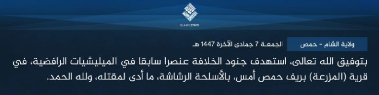 🏴❌🇸🇾 🇸🇾 — In a first, the Islamic State claims responsibility for two attacks in Homs and Hama against former Ba’athist Syrian elements. The first was against a “former Shiite militiaman” in Al Mazra’ah in Homs countryside, who was killed…