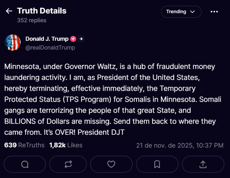 🇺🇸❌🇸🇴 — POTUS Donald J. Trump announces the end of Temporary Protected Status (TPS Program) for Somalis in Minnesota Minnesota, under Governor Waltz, is a hub of fraudulent money laundering activity. I am, as President of the United States, hereby…