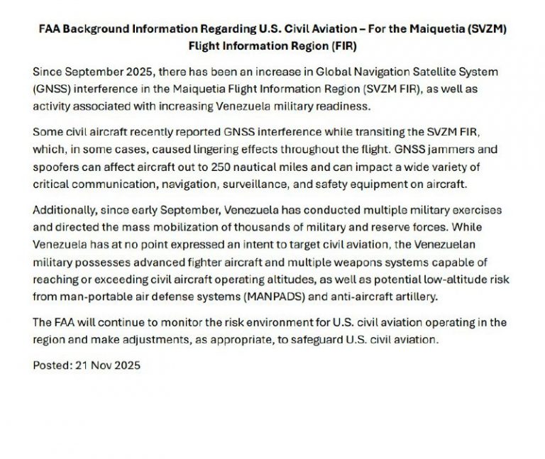 🇺🇸❌🇻🇪 — United States’ Federal Aviation Administration (FAA) has released a NOTAM for the Maiquetía Flight Information Region (FIR) for the “worsening security situation and heightened military activity in or around Venezuela” potentially being a threat to… View Source