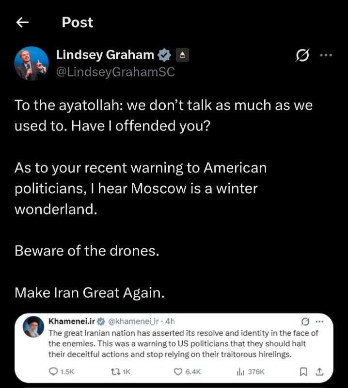 🇺🇸 🇮🇷 🇮🇷 — U.S. Senator, Lindsey Graham: To the ayatollah: we don’t talk as much as we used to. Have I offended you? As to your recent warning to American politicians, I hear Moscow is a winter wonderland. Beware…
