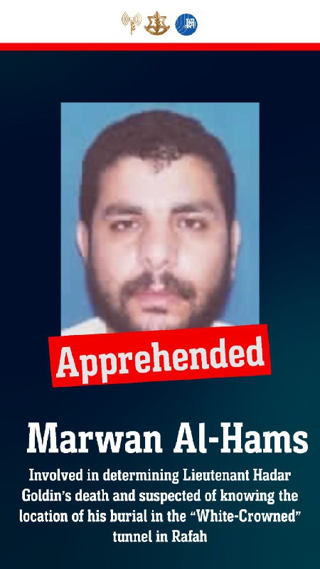 Joint IDF and ISA Announcement: Cleared for Publication: During a Special IDF and ISA Operation, Marwan Al-Hams, Who Was Involved in Determining the Death of Lieutenant Hadar Goldin and Suspected of Knowing His Burial Location in the “White-Crowned” Tunnel in…