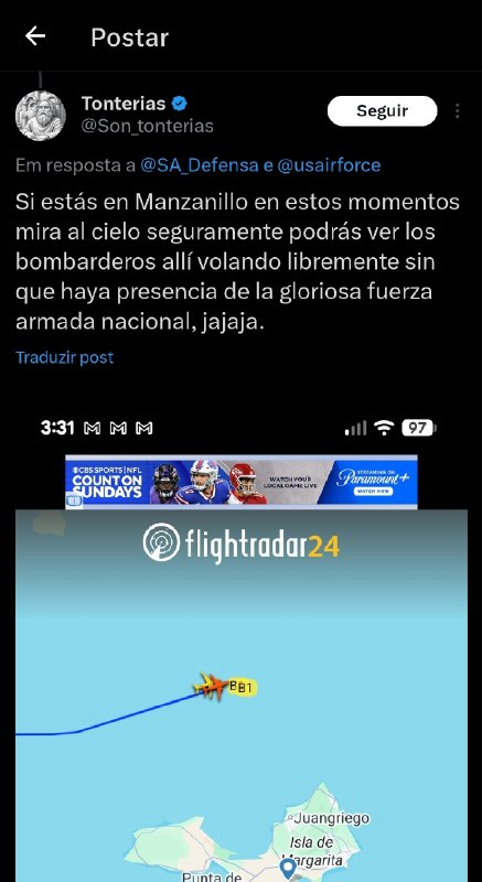 🇺🇸❌🇻🇪 — 2x B-1B Strategic Bombers of USAF sent a “Hello” for the Chavista Elites and their Iranian guests by passing near the La Margarita Island View Source