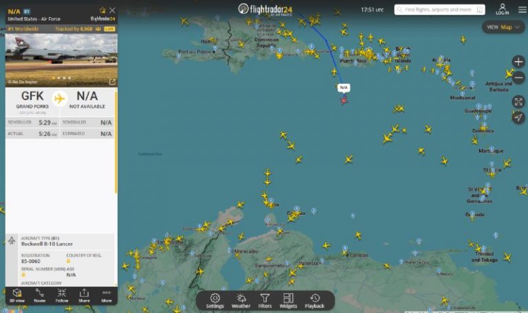 🇺🇸🪖🗺 — 2x B-1B Strategic Bombers of United States Air Force (USAF) spotted over the Caribbean Sea, flying near Dominican Republic Both departed from Grand Forks Air Force Base in North Dakota View Source