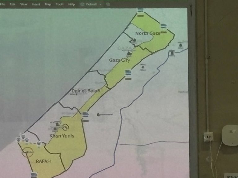 This is the new map of the Gaza Strip, as it will be managed by the international command currently being established in Kiryat Gat, southern Israel. The map is displayed on a giant screen at the command center. As can…