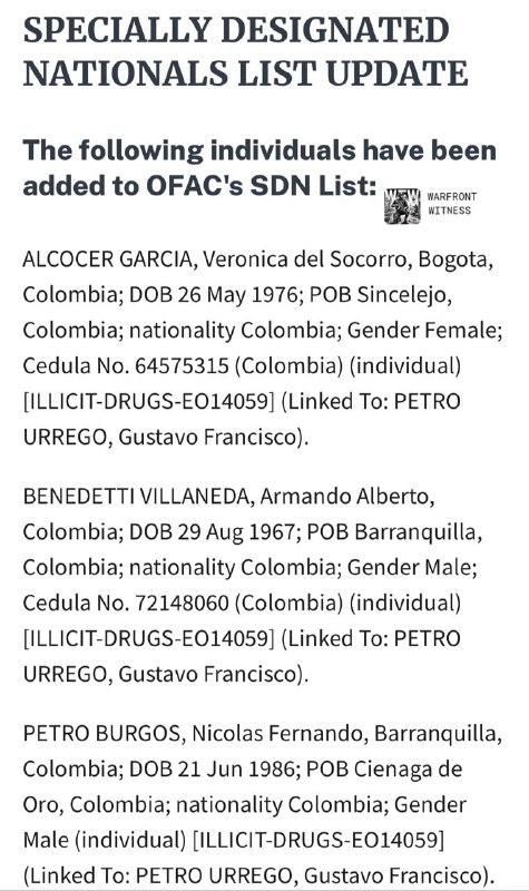 ⚡️🇺🇸🇨🇴Colombian President Petro’s wife Veronica Alocer, his son, Nicolas, and Colombian Interior Minister Benedetti were also sanctioned. The official reason was their connection to Colombian President Petro. @wfwitness View Source