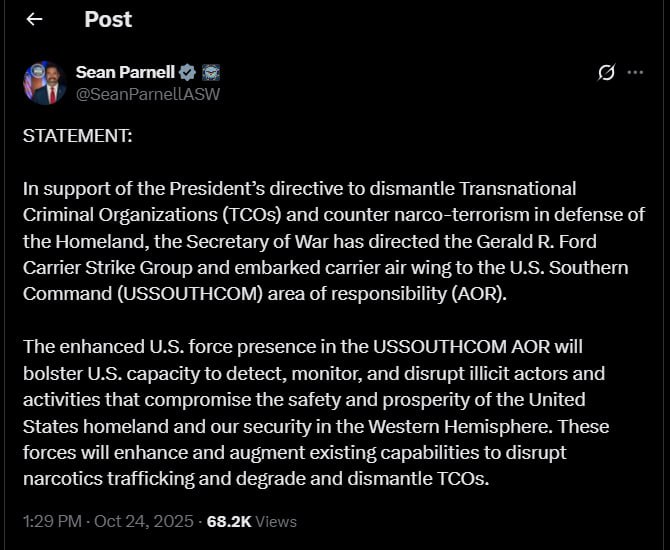 — 🇺🇸/🇻🇪/🇨🇴 NEW: The U.S. Secretary of War Pete Hegseth has ordered the deployment of the USS ‘Gerald Ford’ Carrier Strike Group and accompanying warships into the Caribbean Sea as part of American operations against alleged drug trafficking organizations. @Middle_East_Spectator…