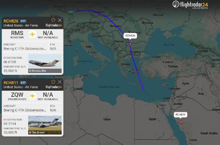 📸🇺🇸✈️🇮🇷 – NEW: Two USAF C-17A from Ramstein and Zweibrücken Air Bases in Germany are currently heading to Middle East likely to Prince Sultan Air Base in Saudi Arabia. Possibly Air Defense equipment in preparation for the anticipated US attack…