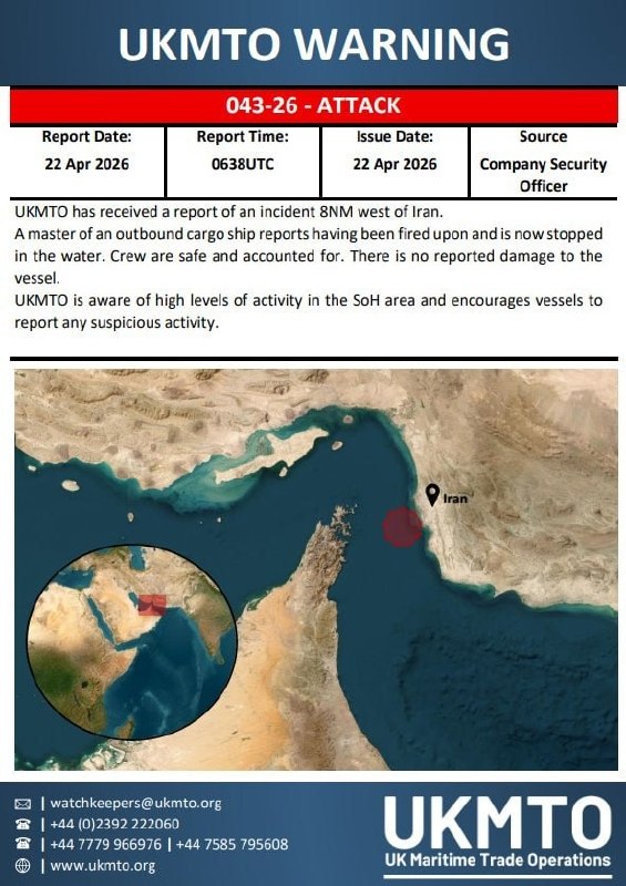 #BREAKING | 🇮🇷 — UKMTO WARNING — 043-26 – ATTACK UKMTO has received a report of an incident 8NM west of Iran. A master of an outbound cargo ship reports having been fired upon and is now stopped in the…